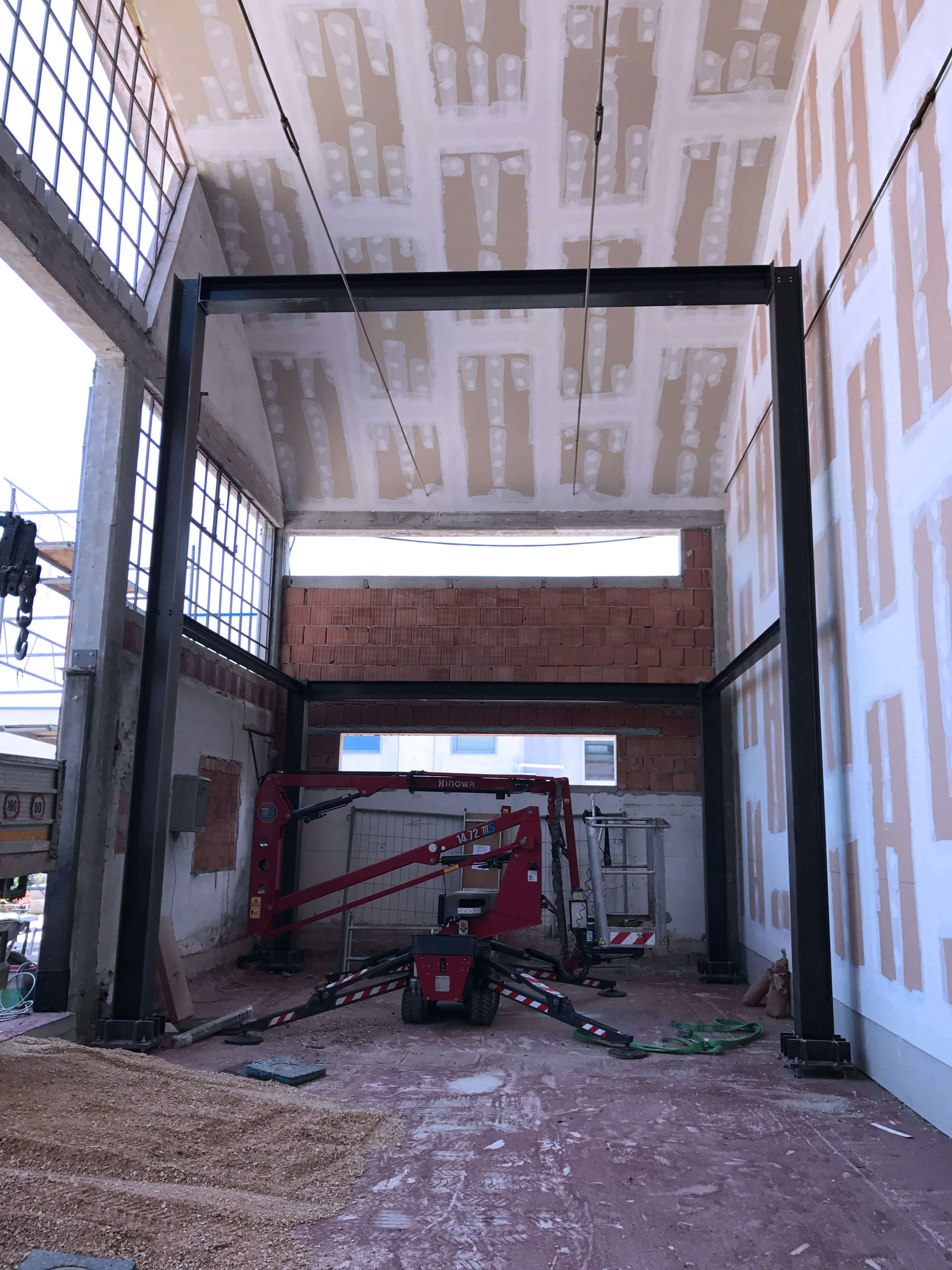 Il progetto prevede un open space con carattere industriale, aprendo il soffitto esistente e ristrutturando il volto originale del capannone. L’intento è di realizzare una scatola dentro la scatola, con la costruzione di una struttura a telaio in ferro tenuta appositamente scollegata dalla struttura in cemento armato preesistente. Lo spazio è mantenuto aperto e luminoso, senza vincoli strutturali, esaltando la luce naturale che entra dalle ampie vetrate.