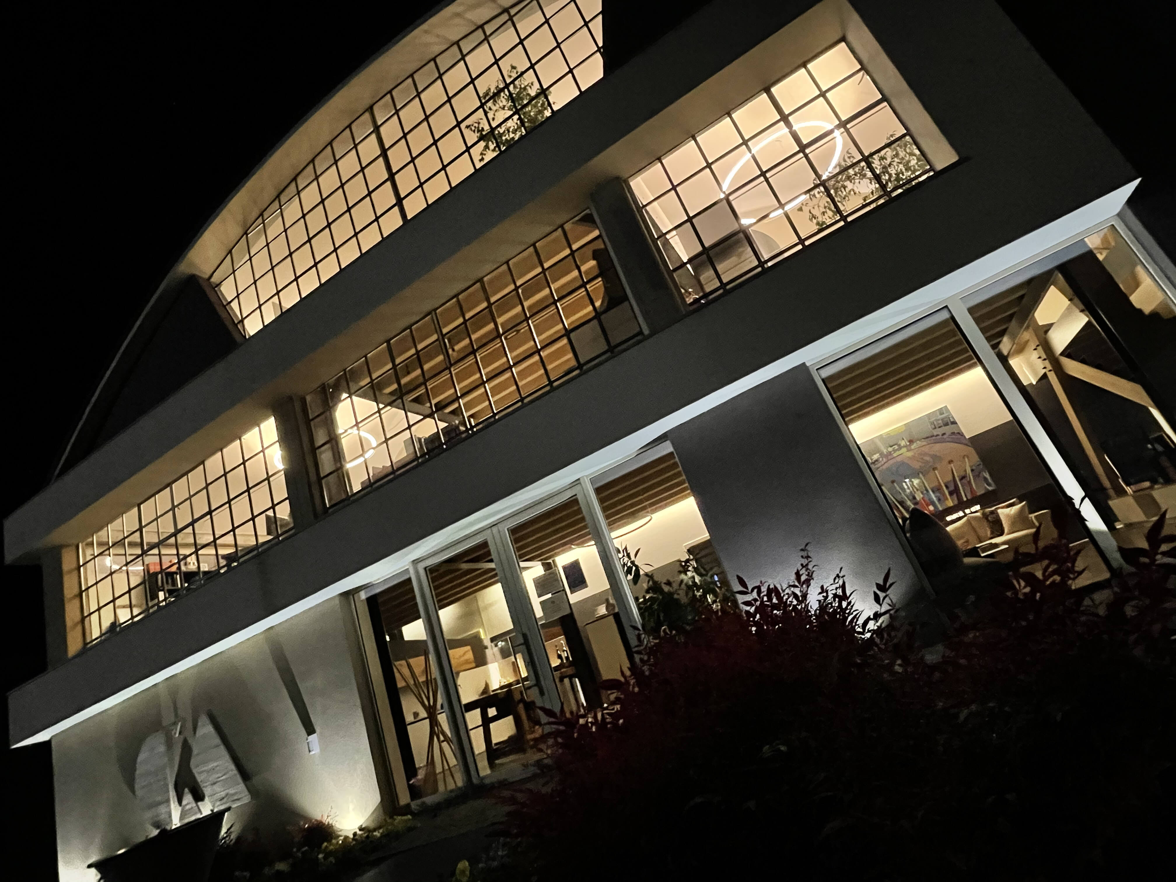 through the large windows.